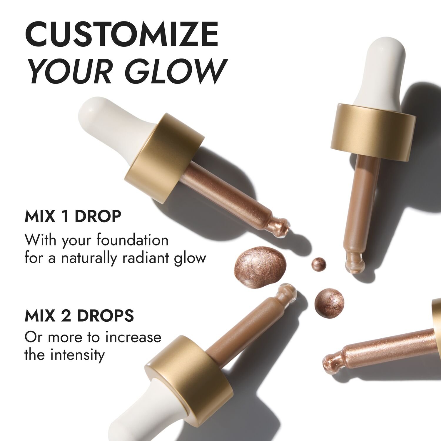 Pump your favorite liquid foundation or moisturizer on the back of your hand. Add 1-2 drops of Custom Enhancer Drops into the formula and blend with a brush or clean fingertip – remember: a little goes a long way. Apply as desired using fingers or a brush. You can also blend a few drops atop makeup as a high-impact highlighter.