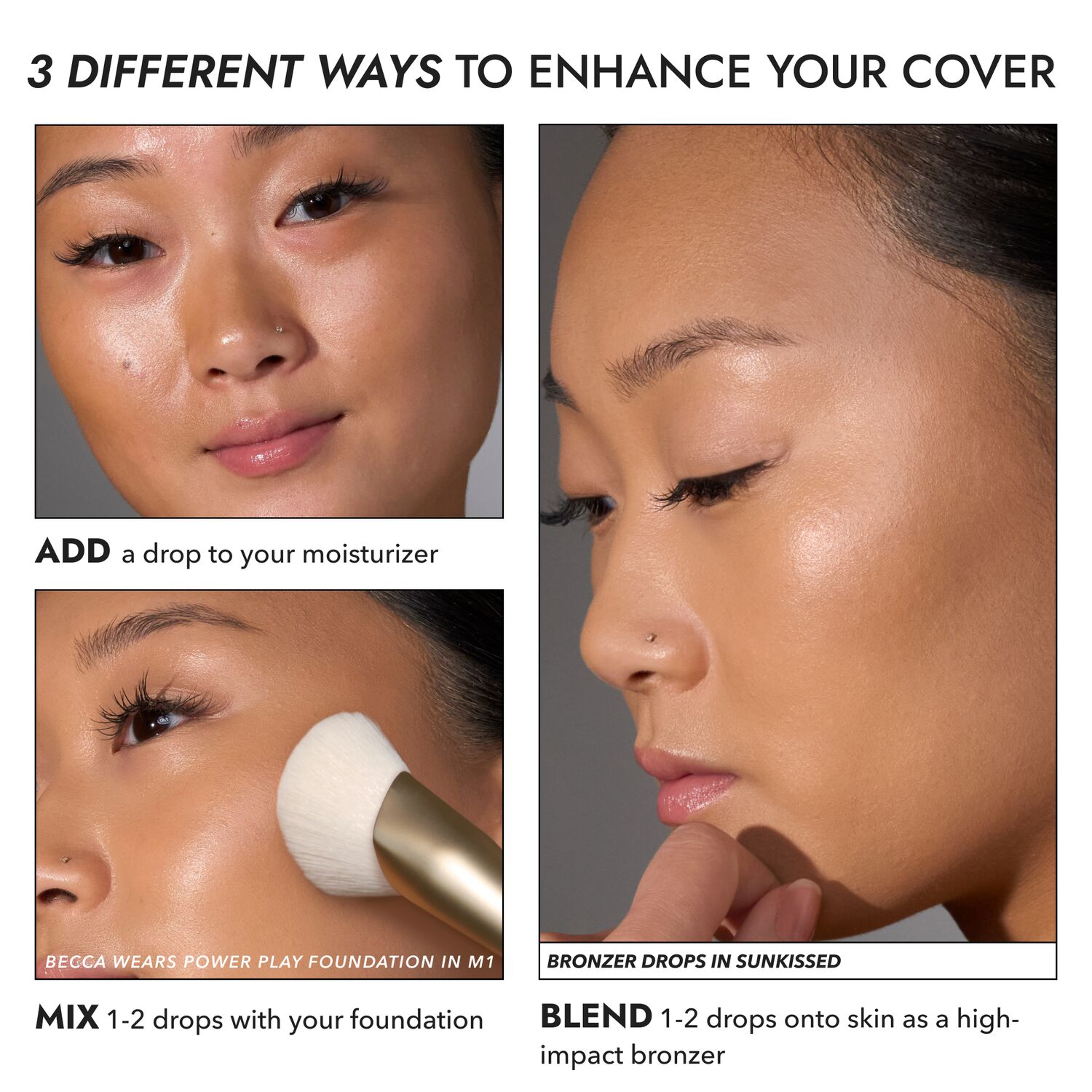 Mix the drops with your foundation using a brush such as the Custom Application Brush or with a clean fingertip and apply as desired.