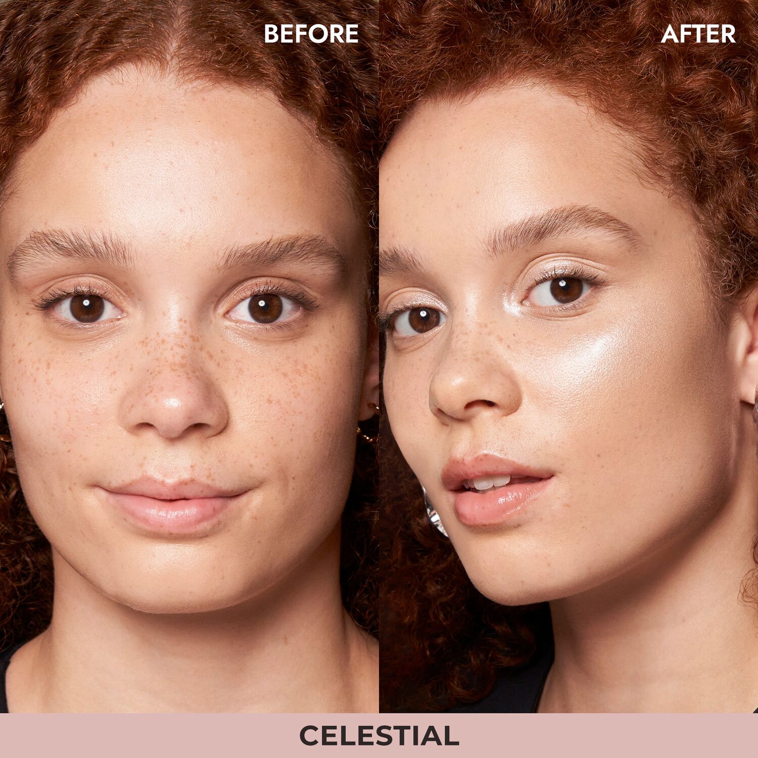 Apply to clean, moisturized skin along with your foundation. If using as a high-impact highlighter, lightly brush onto target areas and then build as desired.