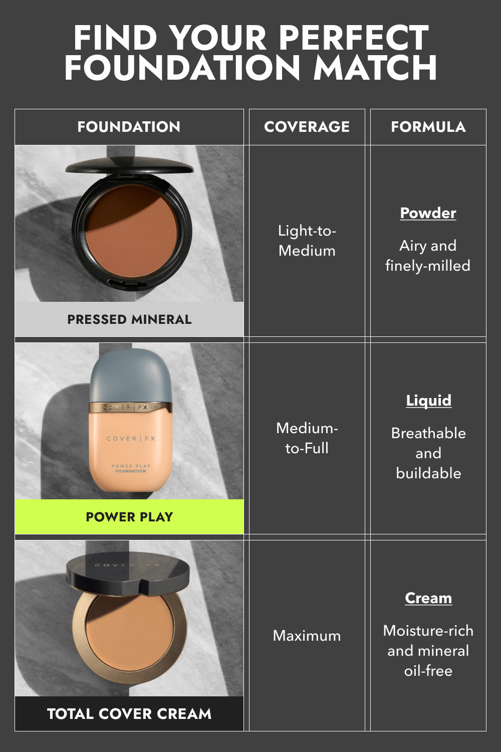 Find your favorite way to cover skin – and all your solutions for any skin concern. Our dermatologist-approved formulas are safe for the skin you’re in, regardless of age, acne, sensitive skin and more. Kick off your full makeup routine with Cover FX Primers that help promote long-wearing makeup, blurred pores, moisturized skin and more. Create an even skin tone and cover discoloration with our range of Cover FX foundations, from full coverage foundations to sheer tinted moisturizers for hydrated and dewy skin. Change up your makeup look with enhancers like our signature Cover FX highlighter drops and fan favorite bronzer drops too, along with highlighter, bronzer and blush palettes too. Don’t forget the best setting powder for oily skin in loose powder and pressed powder options to lock in your makeup all day. Add a high performance makeup setting spray and experience the full effects.