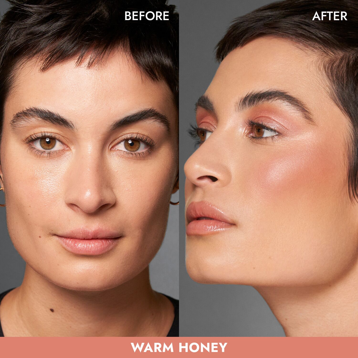 For a natural flush, use an angled blush brush to sweep the matte shade on the apples of the cheek, blending out. You can also blend a small amount along the hairline and temples or across the bridge of your nose for a sunkissed finish. For a luminous touch of highlight, top with the shimmer shade, or simply use the shimmer shade on its own.